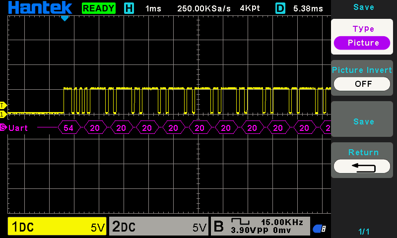 This looks good now. These seem to be ASCII characters with 54 being 'T' and 20 being ' ' (space). We can also see that the UART is using a TTL of 5V.